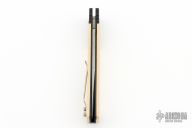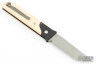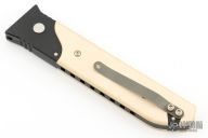 This Jammer side-opening automatic by Rob Dalton features a bead blast chisel grind blade and a black aluminum handle with a ivory paper micarta overlay. Bead blast titanium clip, tip up carry. Strong and fast coil-spring opening. Excellent condition. Comes with original white box.