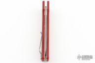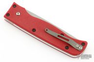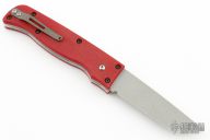 This side-opening automatic features a bead blast chisel ground blade and a red G-10 handle. Bead blast titanium tip up clip. Strong and fast coil-spring opening. Excellent condition. Comes with original white box.