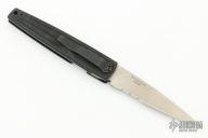 Boguszewski design folder by Benchmade with satin finished partially serrated blade, single thumbstud. Black coated aluminum handle with linerlock. Tip down carry black stainless steel clip. Has some scuffs and scratches, otherwise good user condition.