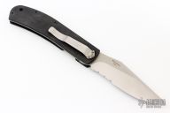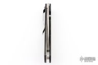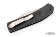 This Vintage Kodiak Bowie Folder from Benchmade features a satin finished clip point partially serrated blade with a single thumb stud. The handle has black aluminum scales over a single stainless steel liner and stand offs. Lanyard hole in pommel. Stainless steel tip down clip. Has some scuffs and scratches, otherwise good condition.