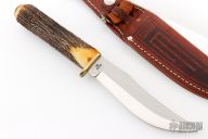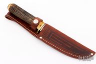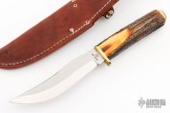 This Hunter from Case Knives features a mirror polished blade with false top edge and notched thumbrest, .117" blade stock and 1.075" blade depth, hidden tang construction. The handle has a brass guard and pommel with stag handle. Includes original brown leather sheath. Has some light scratches, otherwise excellent condition.