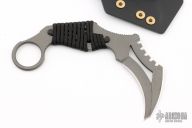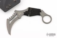 This Karambit from Bawidamann Blades features a tungsten gray cerakote blade with a sharpened top edge and notched thumbrest, .166" blade stock and 1.298" blade depth.  The handle features a red cord wrap and one inch ring. Includes a kydex sheath. Has some sheath marks, otherwise excellent Condition.