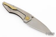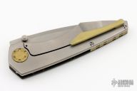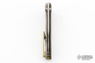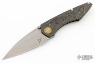 This Mini-Goblin features a bead blasted blade with dual thumb studs.  The handle has a carbon fiber and blasted titanium frame with an anodized titanium backspacer and tip up clip. Rides on bearings, nice detent, lockup and blade seating.  Includes the original box and papers.  New from maker!