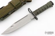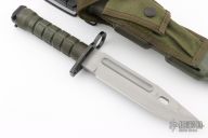 This M9 Phrobis III features a bead blasted spear point blade with sawteeth on the spine and a large fuller, .231" blade stock and 1.446" blade depth, hidden tang construction. The handle has a black steel guard and green plastic grip and can be removed from the handle for cleaning. Comes with original green sheath. Has some scuffs and scratches, otherwise good condition.