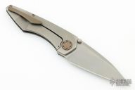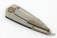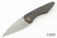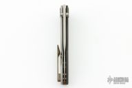 This Mini-Goblin features a bead blasted blade with dual thumb studs.  The handle has a carbon fiber and blasted titanium frame with an anodized titanium backspacer and tip up clip. Rides on bearings, nice detent, lockup and blade seating.  Includes the original box and papers.  New from maker!