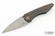 This Mini-Goblin features a bead blasted blade with dual thumb studs.  The handle has a carbon fiber and blasted titanium frame with an anodized titanium backspacer and tip up clip. Rides on bearings, nice detent, lockup and blade seating.  Includes the original box and papers.  New from maker!