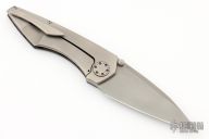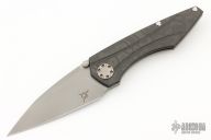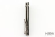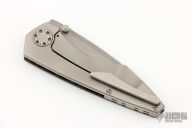 This Mini-Goblin features a bead blasted blade with dual thumb studs.  The handle has a carbon fiber and blasted titanium frame with an anodized titanium backspacer and tip up clip. Rides on bearings, nice detent, lockup and blade seating.  Includes the original box and papers.  New from maker!