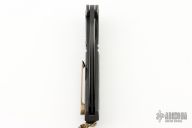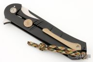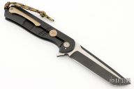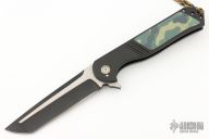 This Rhino 5.0 Flipper by Melvin Lozada features a two-tone tanto blade with swedge and flipper crafted from .250" blade stock. The handle is comprised of a black Gun Kote titanium frame over a black stainless steel backspacer and an anodized and orange peel finished titanium tip up clip, mokume pivot collars and lockbar stabilizer. Great blade seating, detent and lock up and fires open with authority on bearings. Excellent condition. Comes with a zippered case and COA. Camo grip tape has been applied to the frame.