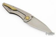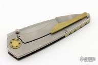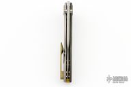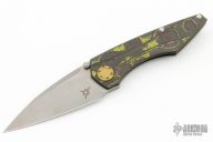 This Mini-Goblin features a bead blasted blade with dual thumb studs.  The handle has a carbon fiber and blasted titanium frame with an anodized titanium backspacer and tip up clip. Rides on bearings, nice detent, lockup and blade seating.  Includes the original box and papers.  New from maker!