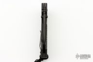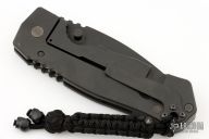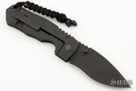 This framelock folder features a black spear point recurve blade with dual thumb-studs and notched thumb-rest. The handle has a carbon fiber scale with black titanium liner and titanium lock-side, black G-10 back-spacer, and tip up titanium clip. Has a couple light scuffs, otherwise excellent condition.