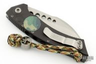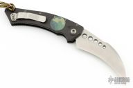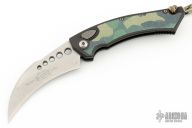 This Hawk Auto by Microtech Knives features a stonewashed hawkbill blade. The handle has a black aluminum frame with blasted stainless steel hardware and tip up clip. Dated 06/2019 and s/n 025 Proof Run. Comes with original box and papers. Has been resharpened, has camo grip tape applied, otherwise excellent condition.