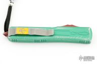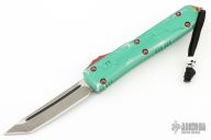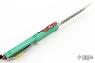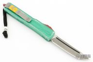 This Star Wars themed Ultratech by Microtech knives features a standard tanto blade with fullers and apocalyptic finish. The handle has a green battle worn aluminum frame with red and yellow hardware. Dated 08/2017 and s/n 02074. Has been resharpened, otherwise good condition. Comes with original box and papers.