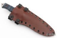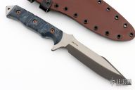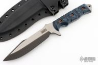 This Mojave 6 by Dawson Knives features Specter finished blade with .214" blade stock and 1.370" blade depth, full tang construction with black/blue G-10 scales. Comes with a brown leather and kydex sheath and COA #046 dated 7/31/21. Excellent condition.
