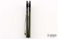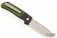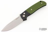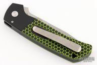 This ATCF Auto by Pro-Tech features a stonewashed Magnacut blade with notched thumbrest. The handle has a black aluminum frame with hexagon milled black/green G10 scales, tip up milled titanium clip with hidden screws.  Pearl inlaid push button. Comes with original box and papers. New from maker at the 2023 USN Gathering.