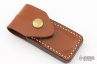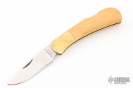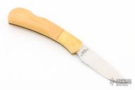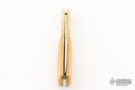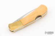 This lock back folder was made for Bianchi by Gerber. It features a mirror polished blade with nail nick. The handle has a brass frame with yellow paper micarta scales, stainless steel backspacer. Comes with original brown leather sheath. Excellent condition.