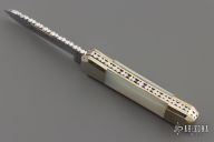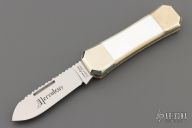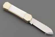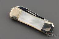 This slipjoint by Parker Custom Series has "Hercules" engraved on the blade with fileworked spine. Nickel silver bolsters, mother of pearl covers, brass liners, fileworked stainless steel spring. Has a couple light scratches, otherwise excellent condition.