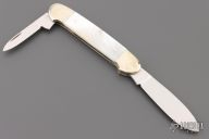 This Slipjoint from AG Russel features a mirror polished blades with nail nicks. The handle has nickel silver bolsters, front and rear, mother of pearl covers with nickel silver liners and stainless steel spring. Made in Germany. Has a few light scratches, otherwise excellent condition.