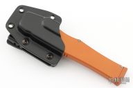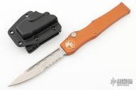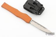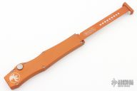 This Halo V OTF automatic has a stonewashed blade with a partially serrated edge. Orange aluminum handle. Comes with original box, papers and kydex sheath. Dated 09/2014 and S/N 07441. Excellent Condition.