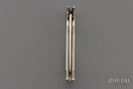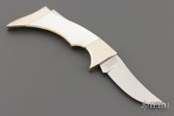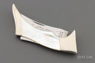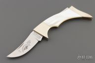 This knife by American Blade features a mirror polished blade with nail nick. The handle has nickel silver bolsters, mother of pearl scales, brass liners and a stainless steel spring. Has some very light scratches, otherwise excellent condition.