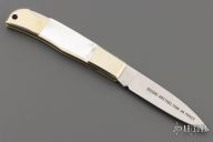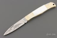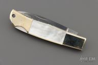 This lockback by Parker has a satin finished blade with nail nick. Nickel silver bolsters, mother of pearl covers, nickel silver liners, stainless steel spring. Has a couple light scratches, otherwise excellent condition.