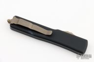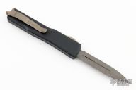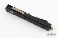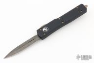 This UTX-70 OTF automatic by Microtech features a Damascus blade with a standard edge. The handle has a black aluminum frame with blasted stainless steel tip down clip. Serial number 249 and dated 02/2019. Comes with original box and papers. Excellent condition.