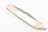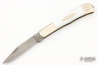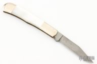 This slipjoint by the American Blade Collectors Association is from 1986. Parker-Edwards Damascus Trapper with nickel silver bolsters and escutcheon, mother of pearl covers, brass liners and stainless spring. Has some light scratches and patina, otherwise excellent condition. #0409 of 3990.