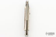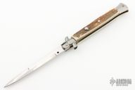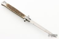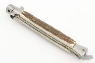 This 11" Picklock by Frank Beltrame features a polished bayonet ground 4mm blade with false top edge. The handle has stainless steel bolsters, front and rear, stag scales, brass liners, stainless spring. Fileworked spine and spring. Excellent condition.
