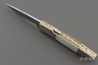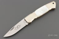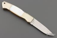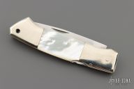 This lockback by Frost Cutlery has satin finished blade with nail nick. The handle has nickel silver bolsters, mother of pearl covers with brass liners, fileworked stainless steel spring. Has some light scratches, otherwise excellent condition.