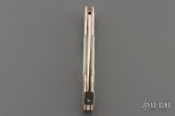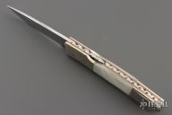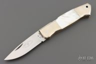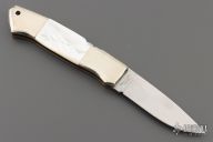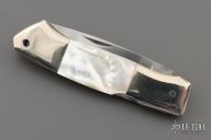 This lockback by Frost Cutlery has satin finished blade with nail nick. The handle has nickel silver bolsters, mother of pearl covers with brass liners, fileworked stainless steel spring. Has some light scratches, otherwise excellent condition.