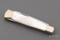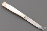 This knife by Weidmannsheil features mirror polished blades with nail nicks. The handle has nickel silver bolsters, mother of pearl covers, brass liners and stainless steel springs. Has a few light scratches, otherwise excellent condition.