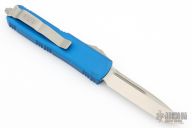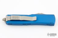 This UTX-85 by Microtech features a satin finished. The handle has a blue aluminum frame with blasted hardware and tip down clip. Comes with original box and papers. Dated 01/2019 and S/N 31544.  Includes the original box. Has a couple light scuffs, otherwise Excellent Condition.
