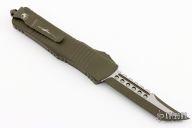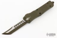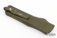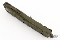This Combat Troodon OTF automatic features a cerakote finish OD Green coated Hellhound blade with satin flats. The handle is composed of a OD aluminum frame. Stainless steel clip. Glass breaker. 06/2018.  Comes with original box and papers. Excellent condition.