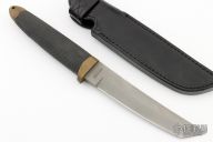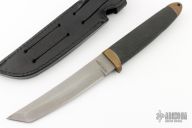 This Recon Tanto from Cold Steel features a bead blasted tanto blade, 3/16" blade stock and 1" blade depth, hidden tang construction. The handle has a brass guard and butt with rubber handle. Comes with black leather sheath. Has a few light scuffs, otherwise excellent condition for its age!