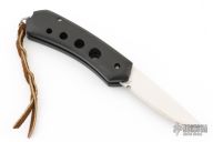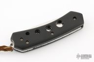 This Left-handed scale release auto by Mike Whiskers Allen features a mirror polished blade with fileworked spine. The handle has black aluminum scales and a fileworked stainless steel backspacer. There is a lanyard hole at the butt. Excellent condition. Nice action, lockup and blade seating.  Comes with nylon belt sheath.