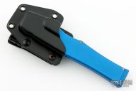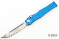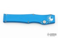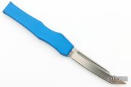 This Halo V OTF by Microtech has a satin finished tanto blade with standard edge. The handle is blue aluminum with bead blasted hardware.  Includes a kydex sheath.  S/N 07154.  Dated 08/2014.  There are a couple of light scratches from the kydex otherwise the knife is in Excellent Condition.