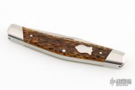 This Muskrat by Reese Bose features two hand rub satin finished blades with swedges and nail nicks. The handle has stainless steel bolsters, jigged bone covers over stainless steel liners and spring. Has half-stop, flush in all positions. Excellent condition. Includes zippered case.
