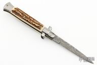 This 9" Picklock by Frank Beltrame features a polished bayonet ground 4mm blade with false top edge. The handle has stainless steel bolsters, front and rear, stag scales, brass liners, stainless spring. Excellent condition.