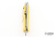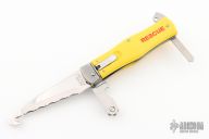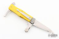 This Rescue Leverlock Auto by Mikov Knives features a polished blade with a serrated edge and cord cutter hook. The second blade is a linerlock, it has glass cutting blades. The handle is comprised of steel bolsters, lever and pins with yellow plastic scales over steel liners and backspacer. Strong leaf spring action. Excellent condition.