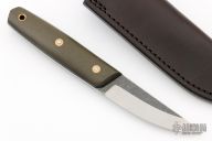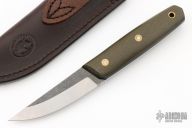 This Loon by Warlander Enterprises features a flat ground drop point blade with spalted flats, .108" thick blade with .892" blade depth, full tang construction. The handle has green g10 scales with black canvas liner, Corby bolts and brass lanyard hole. Excellent fit and finish. Comes with a leather sheath, and COA. New from Maker!