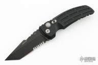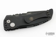 This EX-A01 by Hogue Knives is an Allen Elishewitz design, it features a black tanto partially serrated 154CM blade with notched thumbrest. The handle is black aluminum, tip up or down reversible black stainless steel clip. Has safety. Comes with Hogue box and papers. Excellent condition.