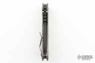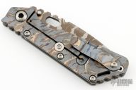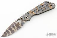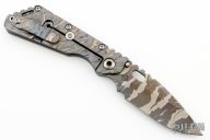 This SMF by Mick Strider features a laser engraved blade with thumbhole and notched thumbrest. The handle has laser engraved titanium frame and tip up titanium clip.  Notches on thumbrest, rear of handle. Nice detent, blade seating and lockup. Excellent condition.