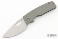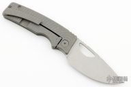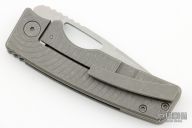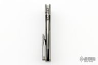 This knife by the OZ Machine Company features a tumbled Magnacut blade with thumbhole and notched thumbrest. The handle features a milled titanium frame with a titanium backspacer and tip up pocket clip with hidden screws. Includes box and papers dated 12-30-22 and s/n 1244. New condition.