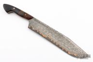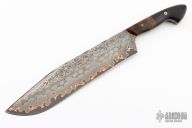 This blade is 15” OAL with a 9” cutting edge in baker forge and tool raindrop pattern sichimai featuring wrought iron cladding, 100 layers of Damascus on each side, copper shims and an 80CRV2 core. The wrought iron cladding is left with some heavily wire brushed forge finish on the flats and rock pattern down the spine randomly showing deeper cuts with copper breakthrough