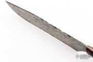This camp knife by Solace Forge features a Baker's Forge Sichimai with wrought iron cladding blade with false top edge and fileworked spine, .173" blade stock and 2.140" blade depth, full tang construction. The handle has burlwood bolsters, black wood scales and natural canvas micarta liners. Comes with a zippered case. New from maker.