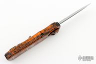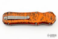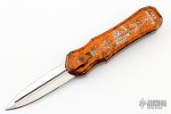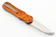 This Excalibur OTF from Piranha Knives features a mirror polished double edge blade with fuller. The handle is comprised of orange splash anodized aluminum with a tumbled tip down clip. Excellent Condition.