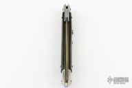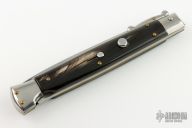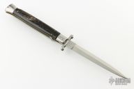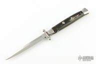 This 11" Swing Guard Auto by Frank Beltrame features a bayonet ground blade with false top edge. The handle has stainless steel bolsters, front and rear, buffalo horn scales, brass liners, stainless spring. Excellent condition.