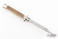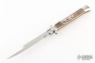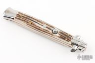 This 11" Swivel Bolster by Frank Beltrame features a mirror polished bayonet ground blade with false top edge. The handle has mirror polished stainless steel bolsters, front and rear, stag scales, mirror polished brass liners and stainless steel spring. Excellent condition. Comes with a brown leather sheath. This one has been tuned and polished by Greg Effects.