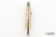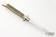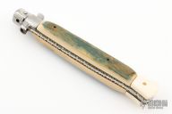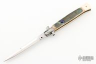 This 11" Swivel Bolster by Frank Beltrame features a mirror polished bayonet ground blade with false top edge with filework. The handle has mirror polished stainless steel bolsters, front and rear, mammoth scales,  fileworked mirror polished brass liners and stainless steel spring. Gold plated screws, Lapis button, and bone bottom bolsters. Excellent condition.
