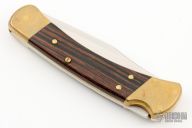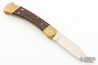"This old classic BUCK knife 110 "Folding Hunter" was first introduced in 1965 - it has been BUCKS mainstay ever since. Some say the Buck 110 is the most copied knife in the world. This Buck automatic knife has a mirror polished blade, spine and spring, wood scales, brass frame and a button that opens knife automatically. A must for any BUCK collection." Has a few light scratches, otherwise excellent condition. Fires nice and strong!