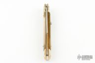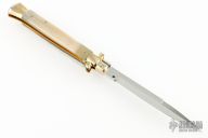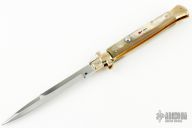 This 11" Picklock by Frank Beltrame features a mirror polished bayonet ground blade with false top edge. The handle has mirror polished nickle silver bolsters, front and rear, honey horn scales, mirror polished brass liners and stainless steel spring. Excellent condition. Comes with a brown leather sheath. This one has been tuned and polished by Greg Effects.